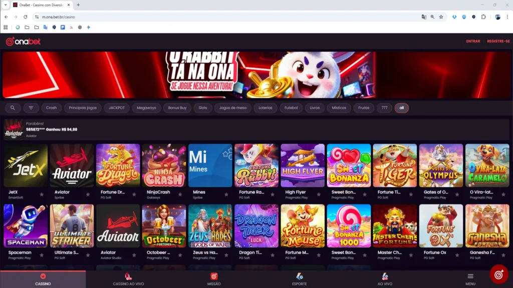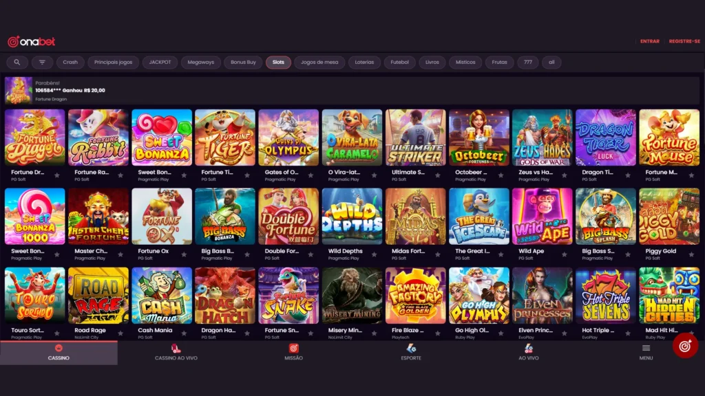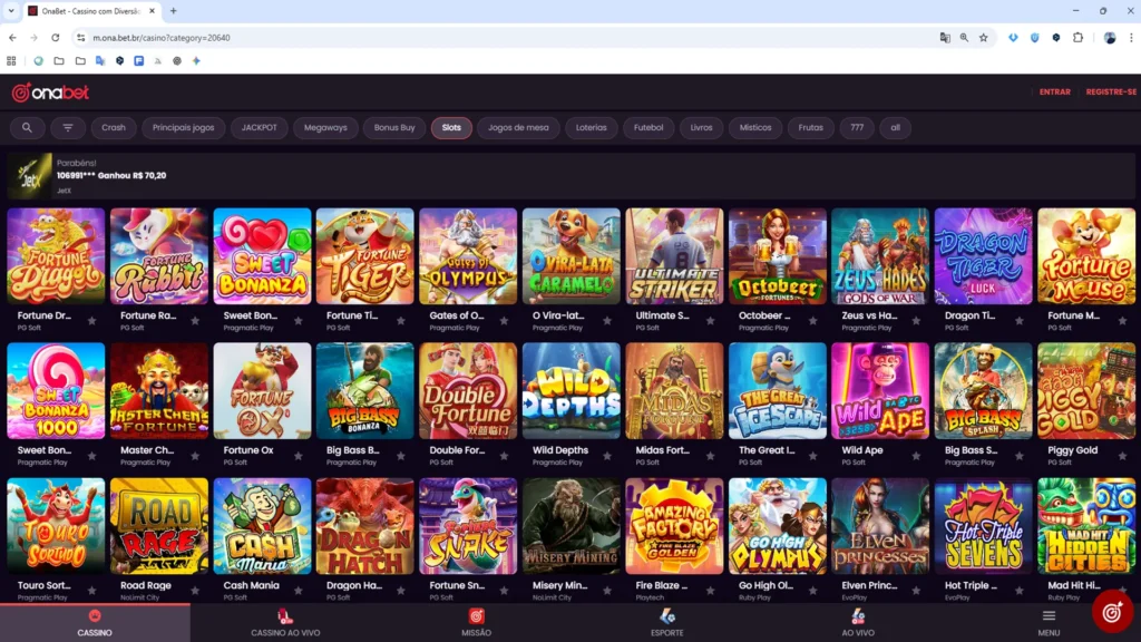 Nos testes que fiz, a Onabet apresentou uma boa variedade de jogos, incluindo um amplo catálogo de slots que vai dos clássicos de frutas até títulos modernos com mecânicas Megaways e cascata. Entre eles, opções populares como Sweet Bonanza e Fortune Dragon se destacam pelo equilíbrio entre diversão e potencial de ganho.