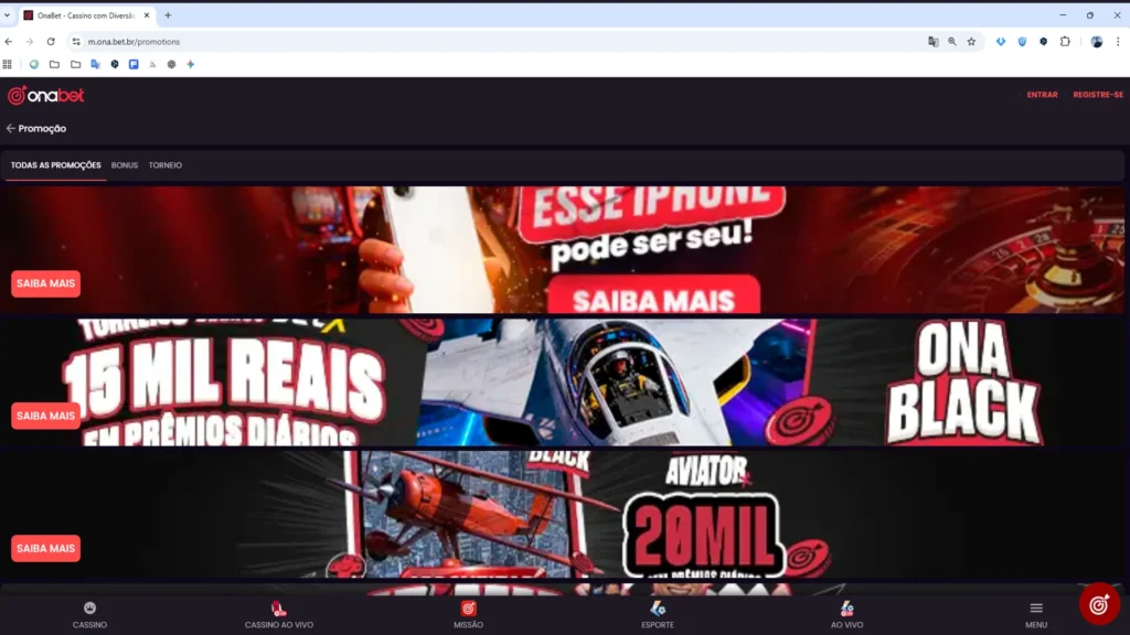 Testando a Onabet em 2025, percebi que não há Bônus de Cassino de registro ou boas-vindas disponíveis para novos usuários. Essa ausência está alinhada às novas exigências da regulação brasileira, que restringiu esse tipo de promoção.